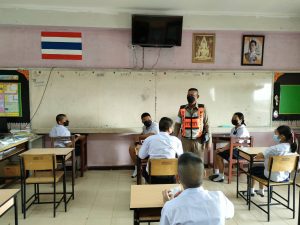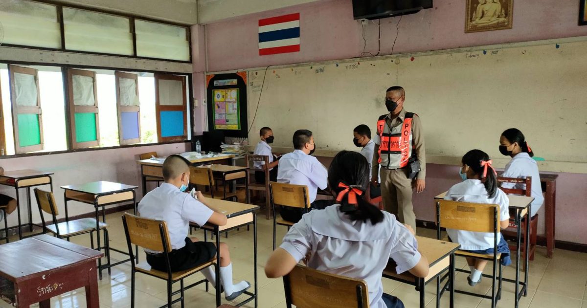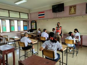 อบมรมนักเรียนชั้น ป.5 โรงเรียนบ้านปากน้ำปราณ เรื่อง การปฎิบัติตามกฎจราจร และประชาสัมพันธ์ผ่านเด็กนักเรียนให้ผู้ปกครองสวมหมวกนิรภัย และลดความเร็วการขับขี่เมื่อเข้าเขตชุมชน