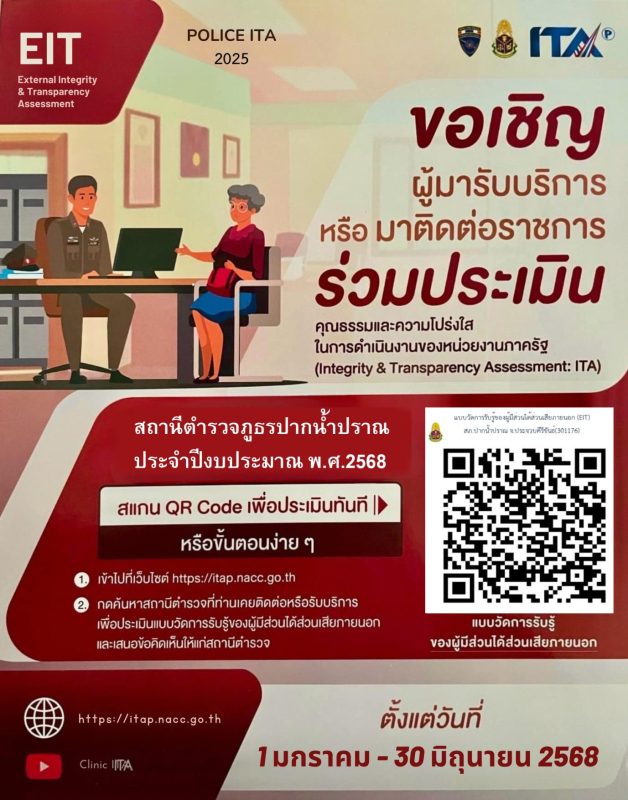 เชิญผู้มารับบริการหรือมาติดต่อราชการร่วมประเมินคุณธรรมและความโปร่งใสในการดำเนินงานของหน่วยงานภาครัฐ (Integrity and Transparency Assessment : ITA) ประจำปีงบประมาณ พ.ศ. 2568 ของสถานีตำรวจภูธรปากน้ำปราณ ประจำปีงบประมาณ พ.ศ. 2568