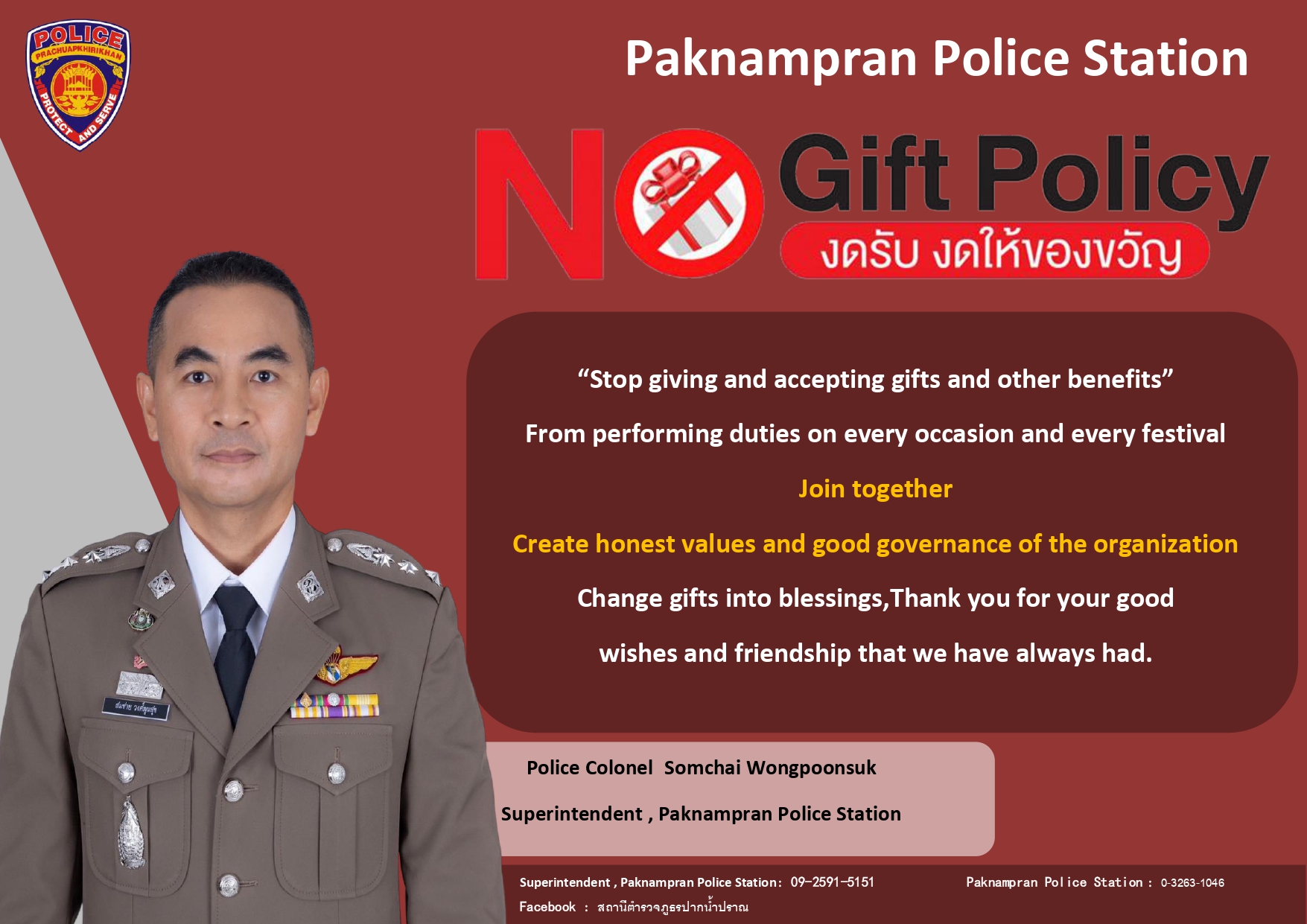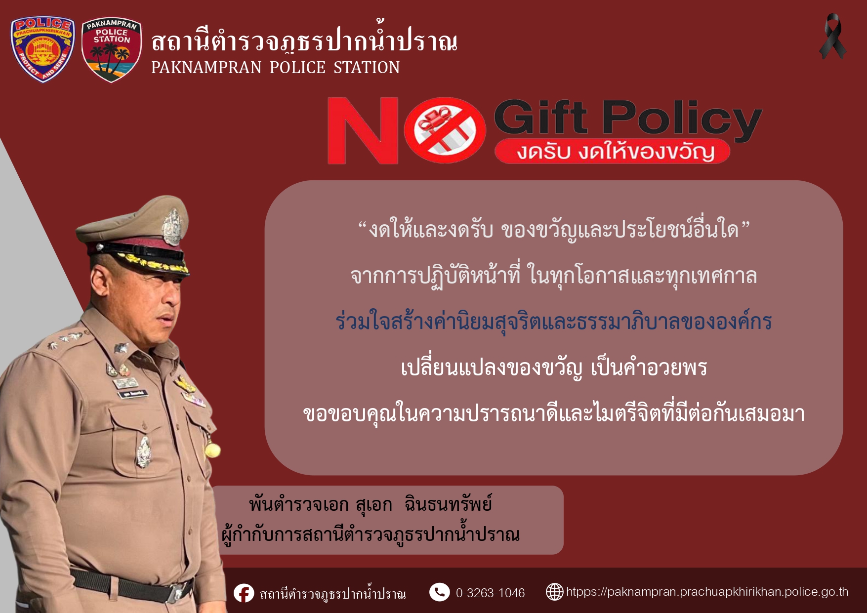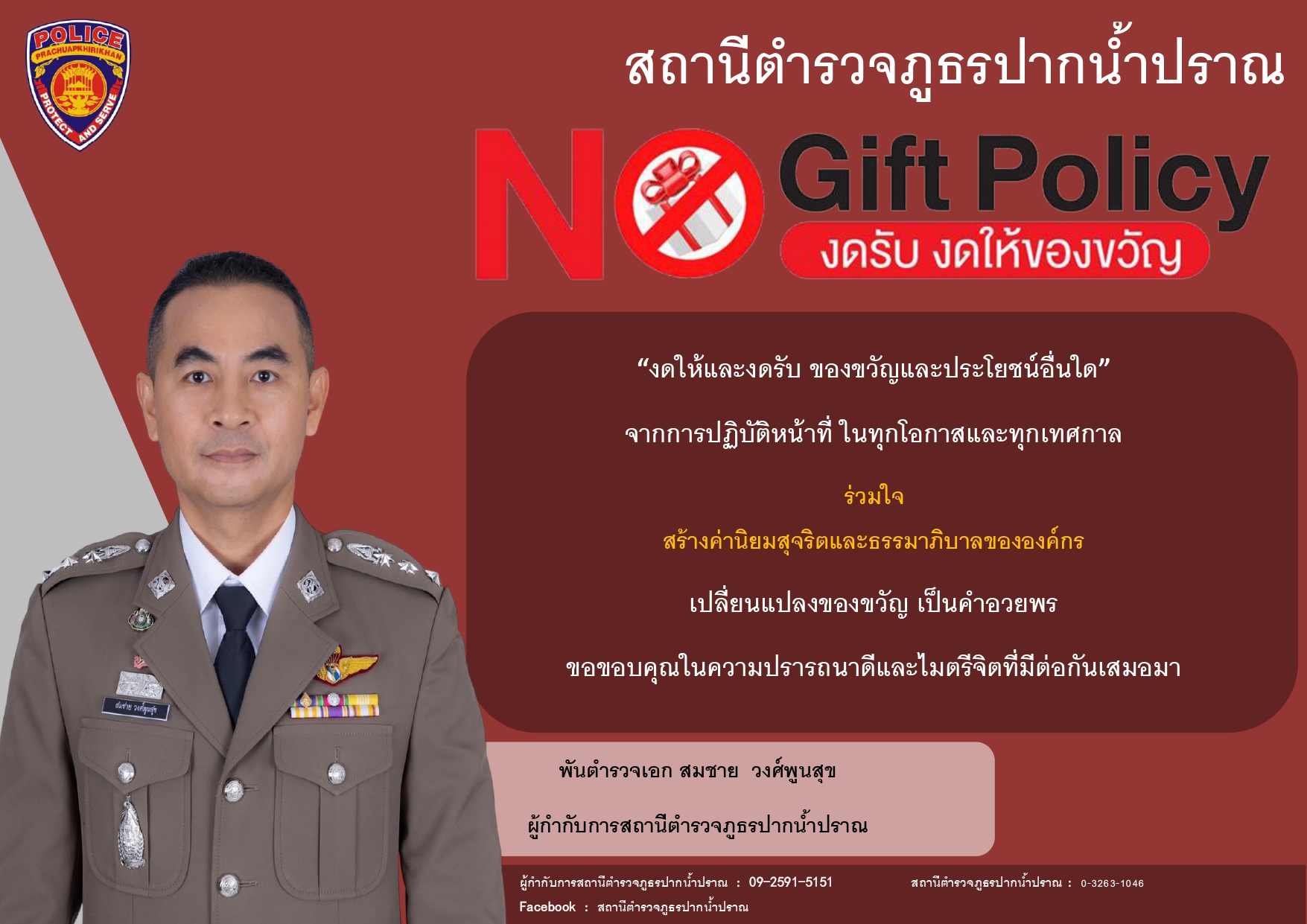- ประกาศสำนักงานยุทธศาสตร์ตำรวจเรื่องเจตนารมณ์ที่จะไม่รับของขวัญหรือของกำนัลทุกชนิดจากการปฏิบัติหน้าที่